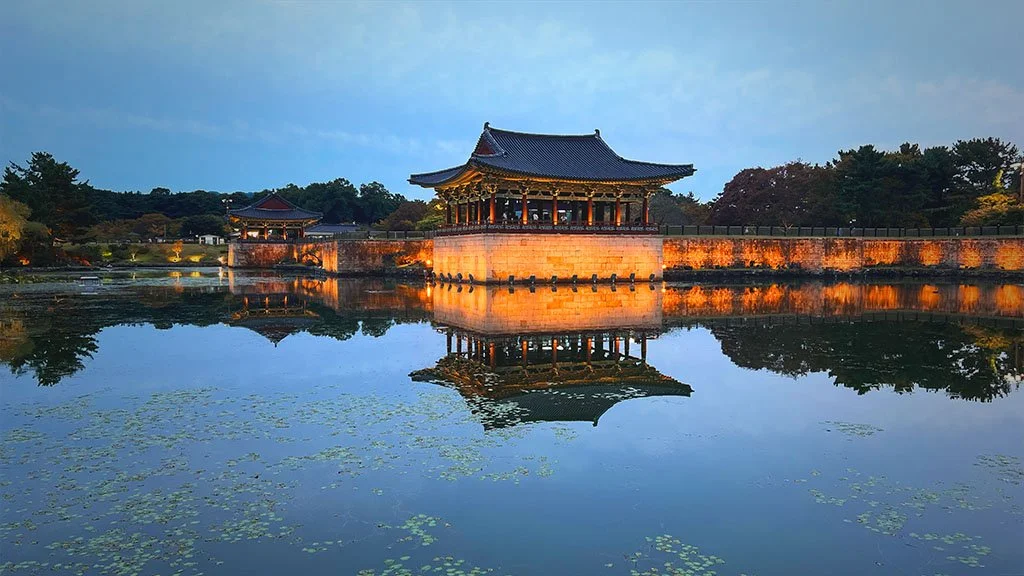 Le palais Donggung et l'étang Wolji, où les pavillons royaux illuminés se reflètent parfaitement dans l'eau sombre de l’étang : un spectacle féerique.