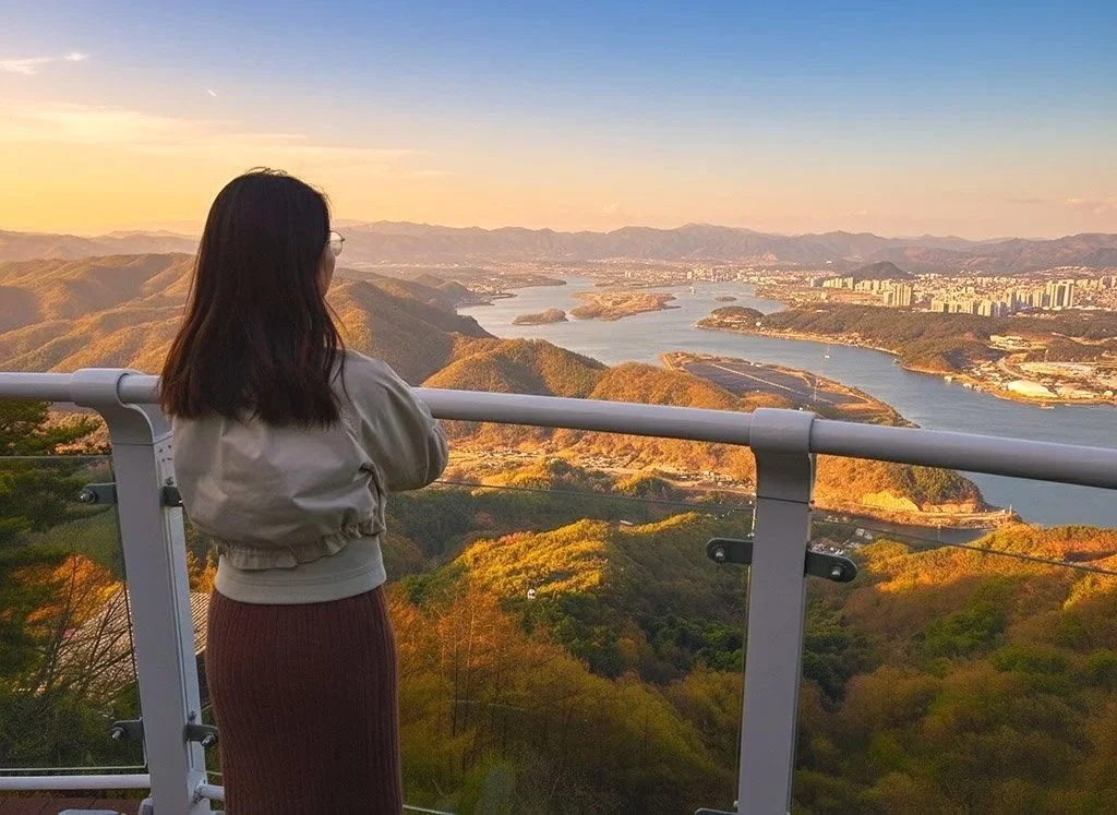 Le clou de la journée ? Le téléphérique de Samaksan. C'est le plus long du pays (3,61 km !). Il survole le magnifique lac Uiam pour nous déposer presque au sommet du mont Samaksan. La vue panoramique sur la ville et les méandres du fleuve est tout simplement spectaculaire.