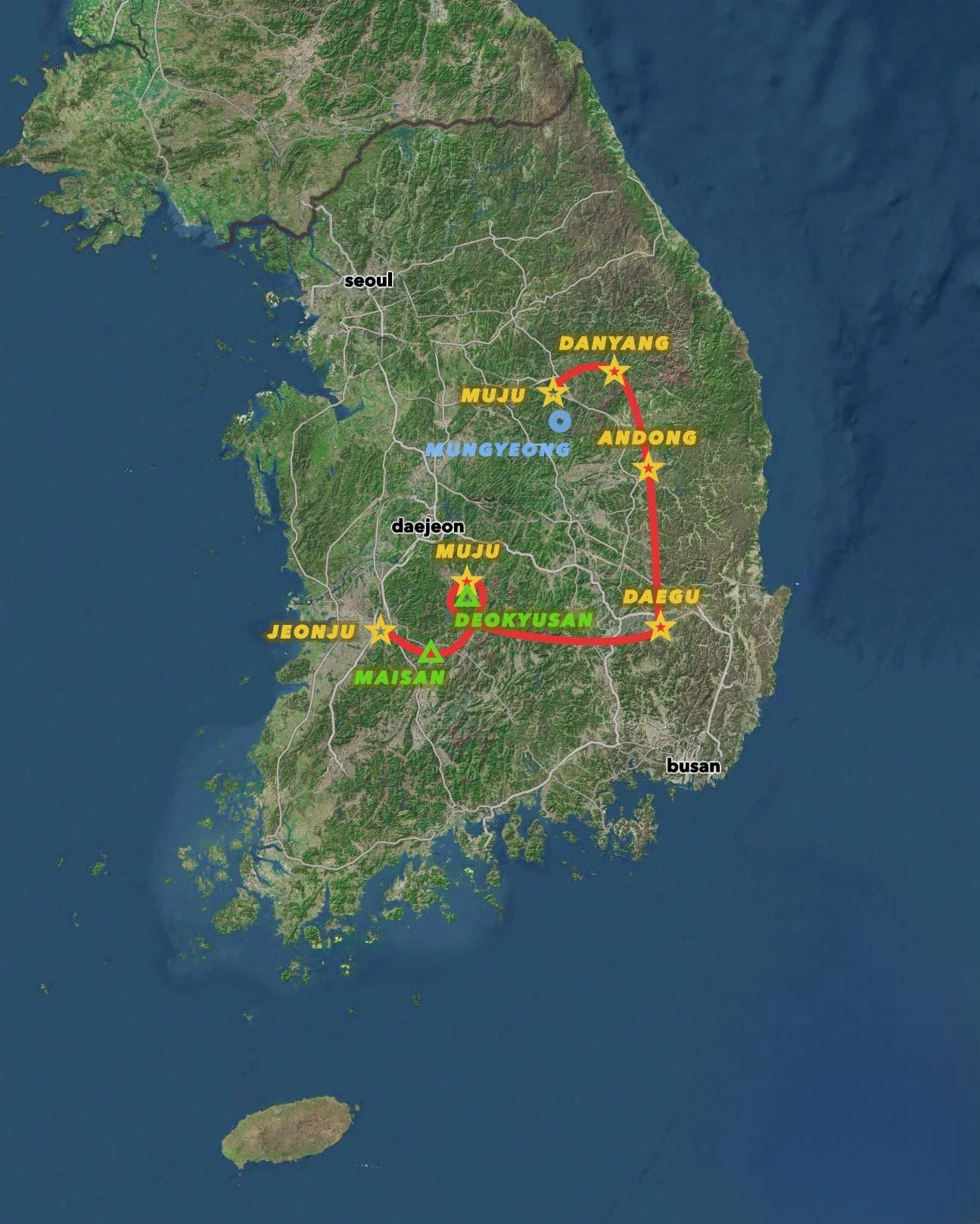 Dans le soucis de vous emmener là où peu vont, nous suivront la côte pour profiter des belles vues maritimes, mais nous nous en éloignerons aussi pour faire un crochet vers un parc national trop peu visité, Juwangsan.